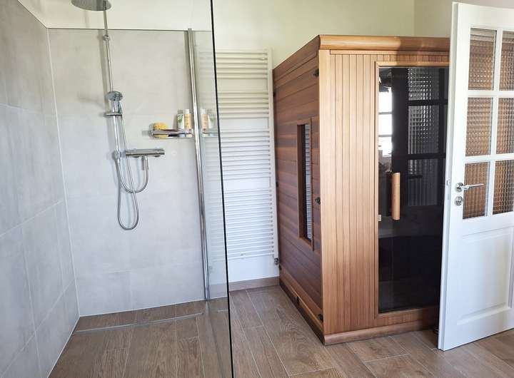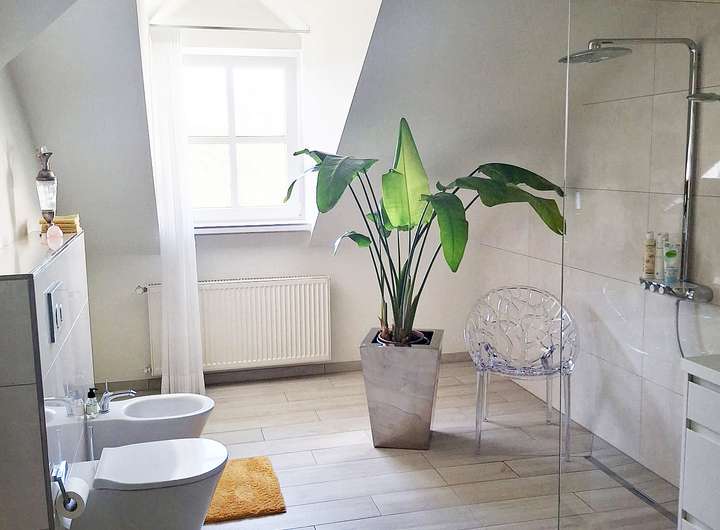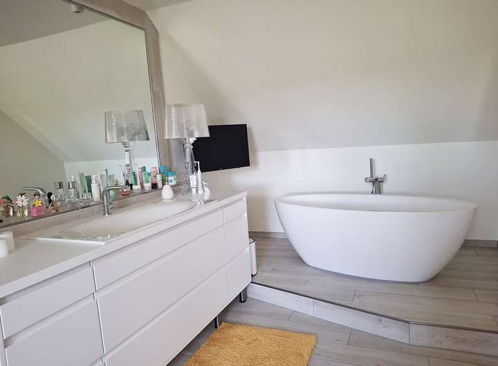 Das großzügige Wellnessbad mit freistehender Badewanne, Sauna und auch hier hochwertiger Ausstattung spiegelt nochmal den besonderen Geschmack und die Exklusivität der Immobilie wider. Das zieht sich durch das komplette Anwesen.