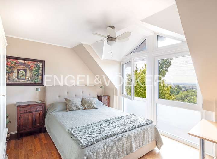 Schon beim Betreten des Hauses werden Sie von einem großzügigen, offenen Wohn- und Essbereich mit einer zeitgemäßen, hochwertig ausgestatteten Küche empfangen. Hier finden Familie und Freunde zusammen und genießen geselliges Beisammensein. Insgesamt bietet das Haus im Erdgeschoss und den oberen Ebenen fünf optimal geschnittene Räume, davon drei gut dimensionierte Schlafzimmer und zwei hochwertig ausgestattete Tageslicht-Bäder. Der üppige zweite Wohnbereich wird durch einen stilvollen Kamin akzentuiert, während hochwertige Parkettböden ein Gefühl von Wärme und Eleganz vermitteln. Beeindruckend ist der weitläufige, bis in den Giebel offene Masterbereich mit Panoramablick über die Main-Ebene bis nach Frankfurt. Dieses Konzept im Masterbereich bietet Platz für einen Schreibtisch, eine großzügige Ankleide sowie ein semi-offen gestaltetes Wellness-Bad mit Waschtisch, Walk-in-Dusche und großer Wanne. Zwei helle und gut dimensionierte Zimmer und ein Duschbad bieten bieten sich als Schlaf- oder Arbeitszimmer.