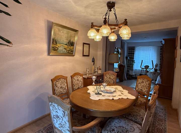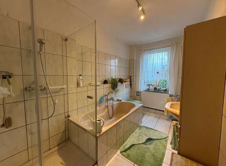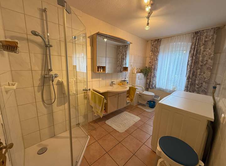 Im Erdgeschoss gelangt man vom Hausflur aus in das ca. 2019 gemachte Badezimmer mit Dusche und Waschmaschinenanschluss und in den großzügigen Wohn-Essbereich mit angrenzender Küche.