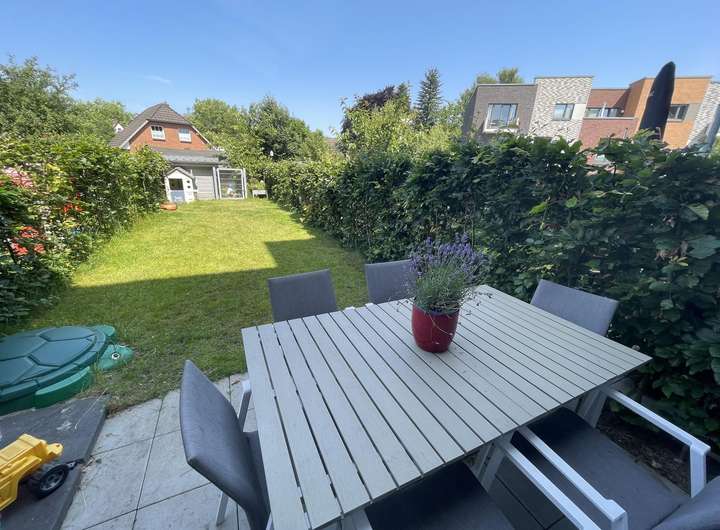 Vom offenen Küchen/Wohnbereich im Erdgeschoss kann man direkt durch die großzügigen Terrassenflügeltüren in den schönen Garten eintreten. Hierzu gehört auch ein Gartenhäuschen, welches praktische Nutzfläche und Platz für Fahrräder bietet.