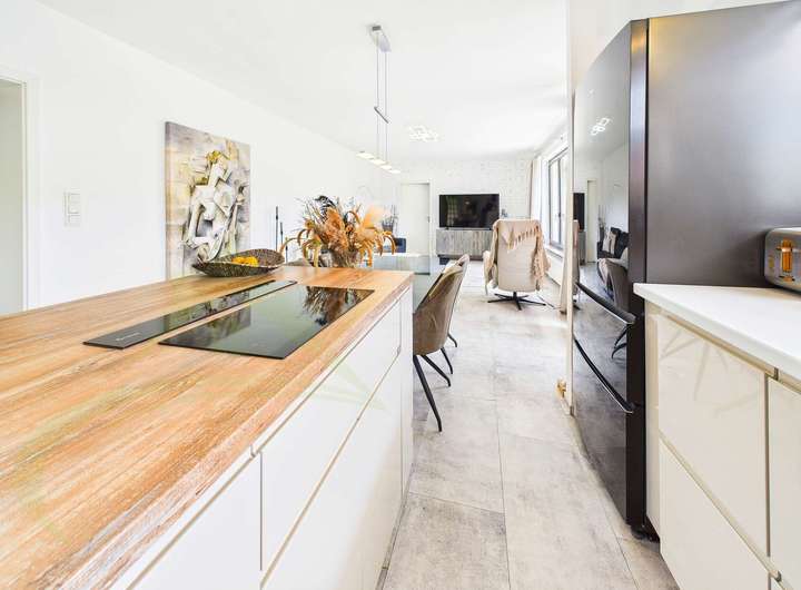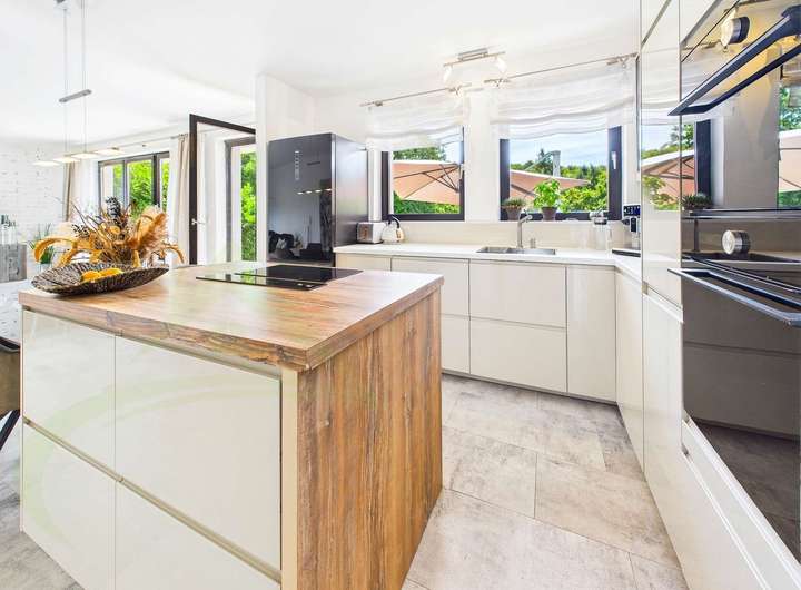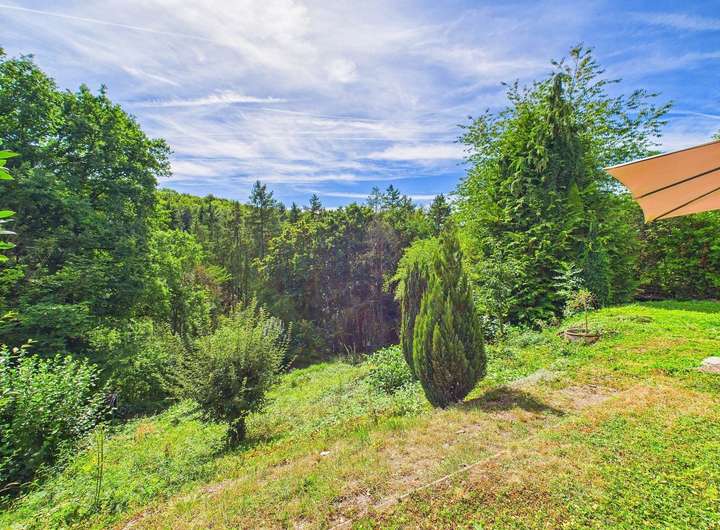 Große Fensterfronten, eine offene Einbauküche sowie Balkon und Terrasse fangen das Licht ein und lassen die Natur förmlich Teil des Wohnraums werden. Im Garten genießen Sie die Vorzüge der Hanglage: eine offene, weite Sicht und das Gefühl, mitten in der Natur zu wohnen. Zu jeder Jahreszeit erleben Sie hier besondere Momente – vom Frühlingsgrün über Sommerabende bis hin zur verschneiten Winterlandschaft.