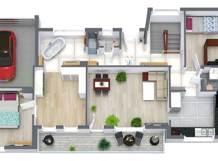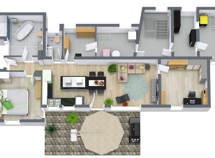 Gartengeschoss: Separater Eingang mit Flur, offene Wohnküche mit Wohn- und Essbereich, Zugang zur Terrasse, Schlafzimmer, Badezimmer, Arbeitszimmer oder Kinderzimmer, Abstellraum, Zwei weiter Abstellräume und der Heizraum