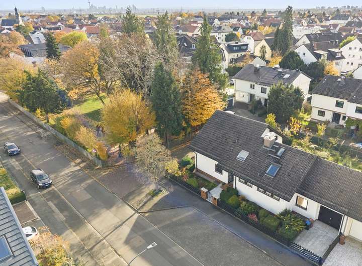 Die Immobilie befindet sich in einem grünen, familienfreundlichen Viertel, das eine ideale Balance zwischen städtischer Infrastruktur, internationaler Erreichbarkeit von Schulen und Unternehmen sowie einer ruhigen, naturnahen Umgebung bietet. Perfekt für Familien, die Ruhe, Komfort und viel Platz schätzen – und dennoch in der Nähe der Metropole Frankfurt leben möchten.