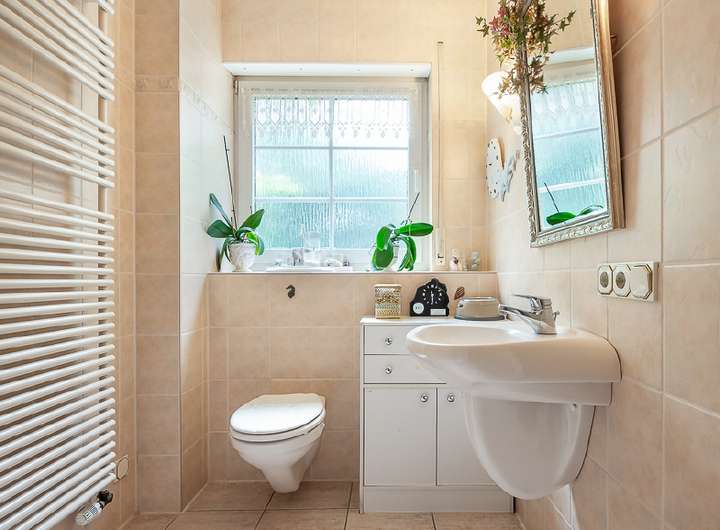 - Duschbad (Erdgeschoss): Fliesen hell terracottafarben, Sanitärobjekte creme