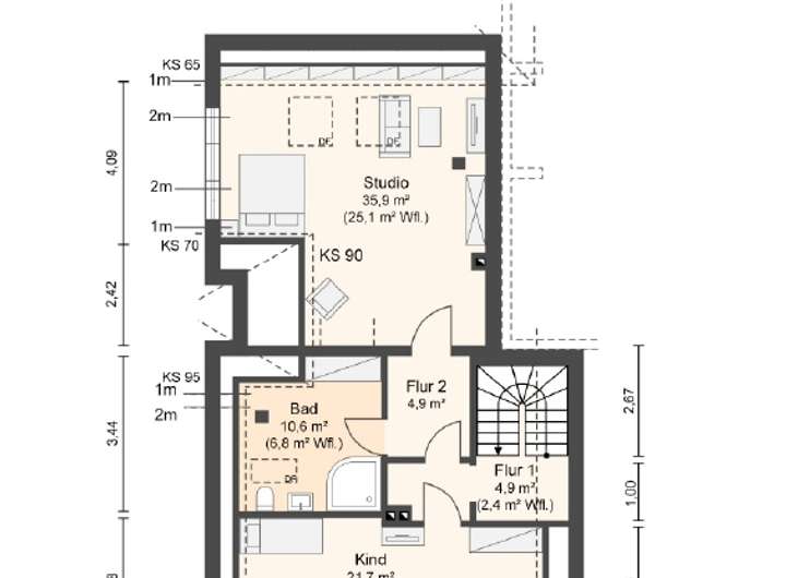 - Raumhöhe (m): UG: 1,87 - 2,21; EG: 2,48 - 2,71; OG: 2,49 - 2,55; DG: bis zu 2,27 - 3,8 (Schrägen)