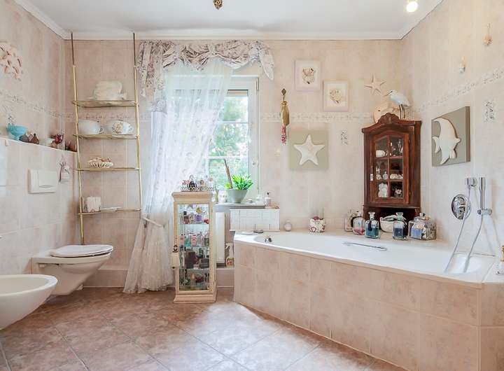 - Wannenbad (Obergeschoss): Fliesen und Sanitärobjekte beige
