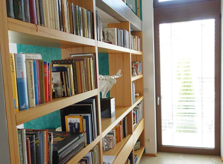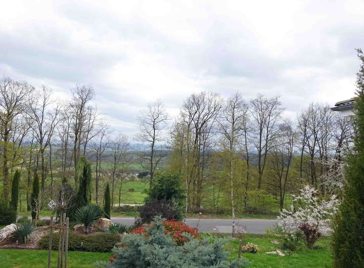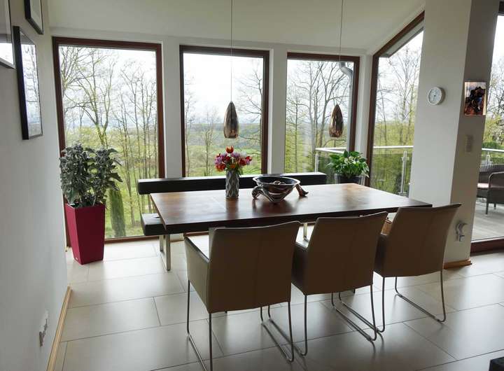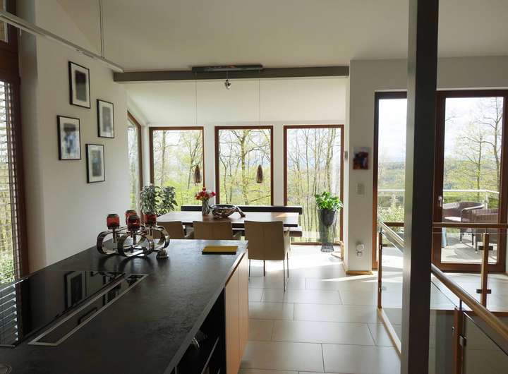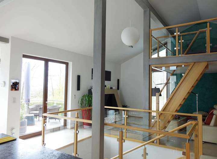 Die Wohnebene im OG besticht durch die sehr exklusive und moderne Küche mit großzügigem Küchenblock, dem Esszimmer mit toller Aussicht und dem angrenzenden Wohnbereich. Alle Räume gehen nahtlos ineinander über und werden durch das großzügige offene Treppenhaus unterbrochen. Eine Galerie im Wohnbereich, die aktuell als Büro genutzt wird, gibt dem Raumgefühl eine weitere Aufwertung und die Garderobe sowie das Gäste-WC runden diese Etage perfekt ab. Vom Wohn-/Essbereich haben Sie Zugang zu einem Balkon der einen phantastischen Ausblick aufs eigene Grundstück sowie über die Golfanlage bis nach Bad Kreuznach bietet.