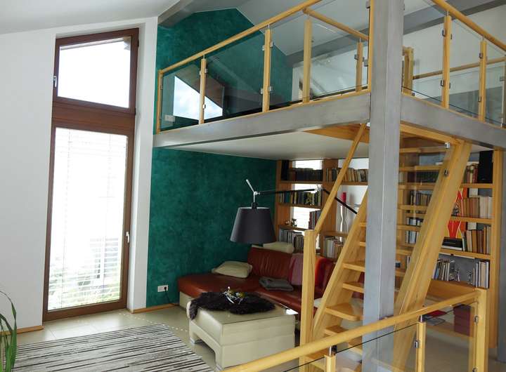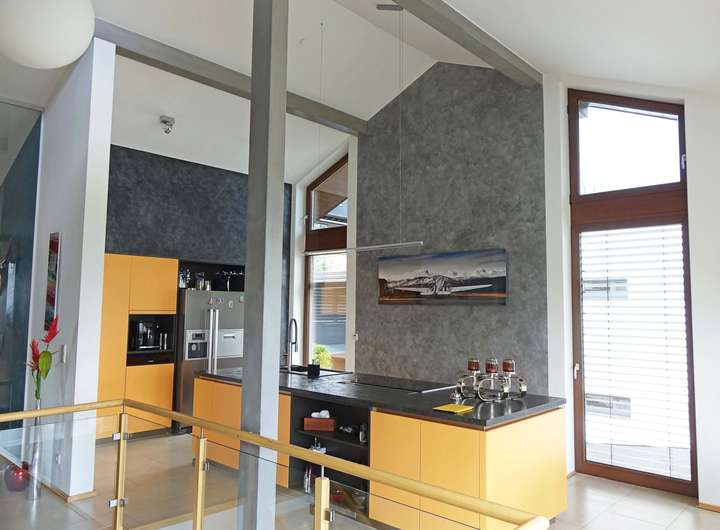 Aber nicht nur die repräsentative Optik brilliert, sondern vor allem die offene, zeitgemäße und überaus lichtdurchflutete Bauweise mit hohen Türen und der Öffnung zum Giebel.