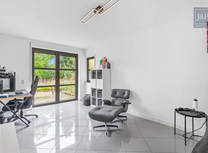 Die großzügige Bauweise ermöglicht ein komfortables, barrierefreies Wohnen. Im gesamten Haus sorgt eine Fußbodenheizung für ein angenehmes Raumklima. Der offen gestaltete Wohnbereich mit großen Fensterfronten schafft eine helle, freundliche Atmosphäre und öffnet sich direkt zur Sonnenterrasse und in den großen Garten. Hier erwarten Sie ein Teich, ein Pool sowie ein liebevoll angelegter Außenbereich – ein Rückzugsort mit hohem Erholungswert.
