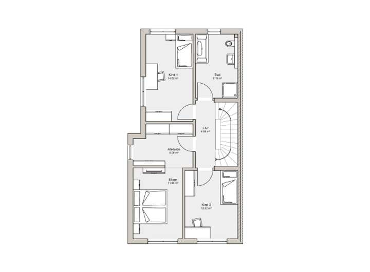 Im Obergeschoss haben zwei Kinderzimmer mit 12 bzw. 14 Quadratmetern Platz. Beim Spielen muss auf keine Schrägen geachtet werden, denn das Doppelhaus verfügt über zwei Vollgeschosse. Die zwei Vollgeschosse vermitteln gemeinsam mit dem Walmdach Villencharakter. Zudem befindet sich in der oberen Etage ein Eltern-Schlafzimmer mit großzügiger Ankleide und ein Familien-Badezimmer.