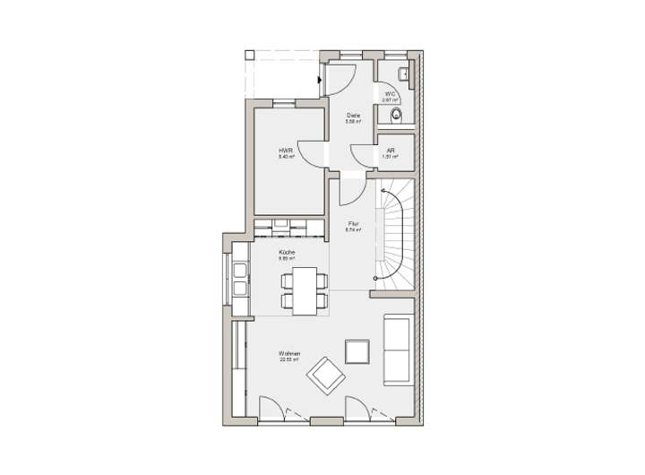 Durch einen überdachten Eingangsbereich gelangen Sie trockenen Fußes in Ihre massive Doppelhaushälfte. Einkäufe können Sie direkt neben dem Eingang im Hauswirtschaftsraum oder im Abstellraum unterbringen. Highlight des Erdgeschosses ist die offene Raumkonzeption von der Küche hin in den Wohn- und Essbereich. Das Erdgeschoss wird komplettiert durch ein Gäste-WC im Eingangsbereich. Durch bodentiefe Fenster werden die Räume zur Gartenseite sowohl im Erd- als auch im Obergeschoss lichtdurchflutet.