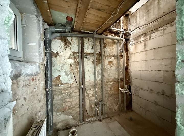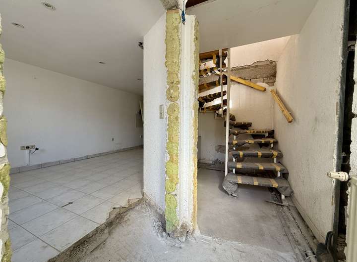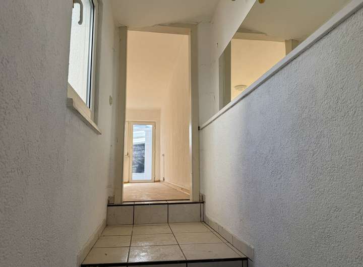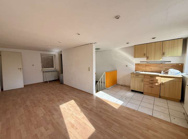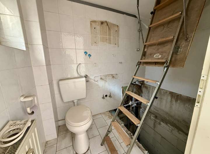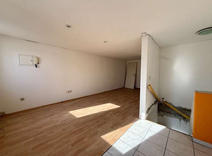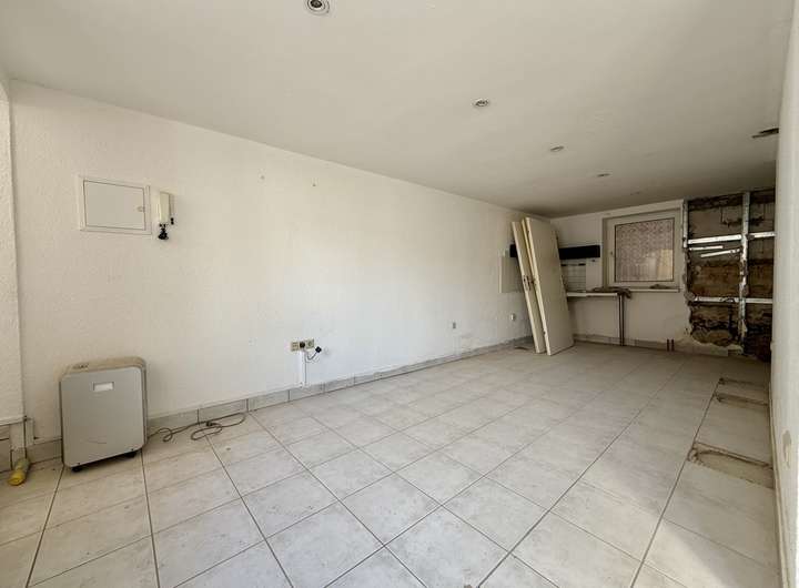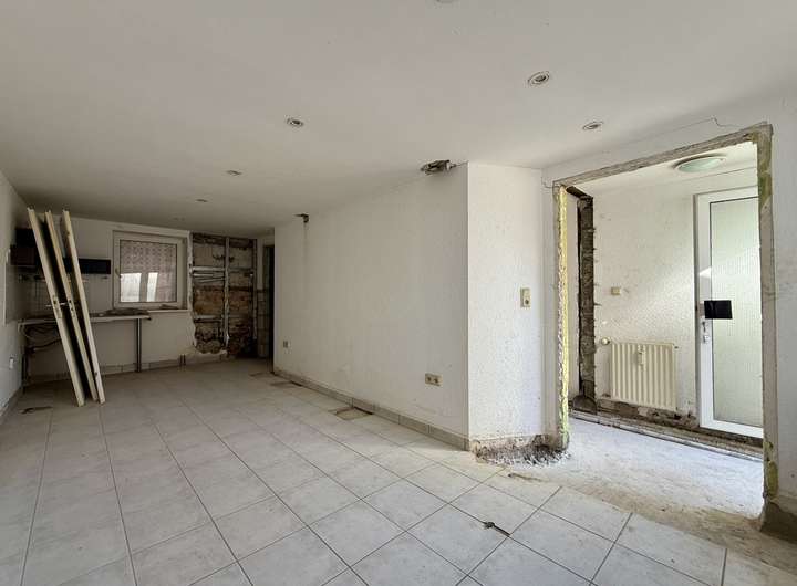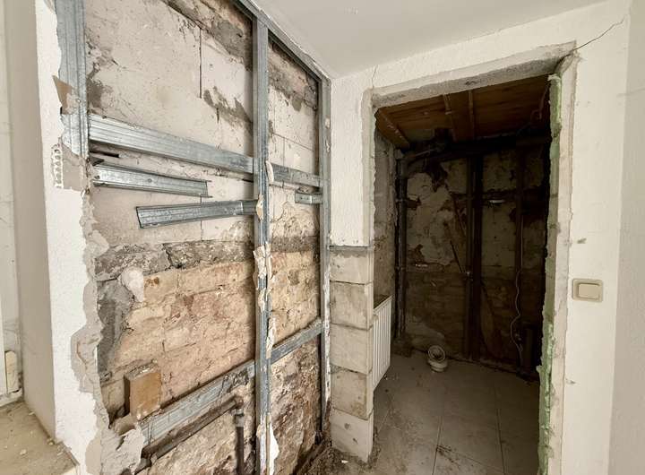Die Rückbauarbeiten in EG und OG (Bäder, Estrich, Türen) sind erfolgt, die Wiederherstellung steht noch aus. Laut Statikgutachten ist eine Tragwerksstabilisierung erforderlich.