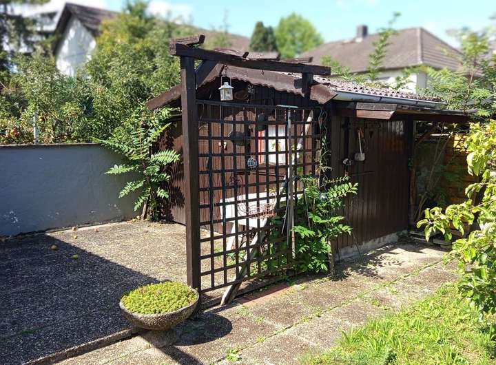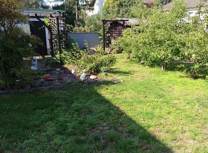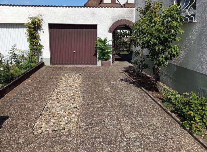 Das schöne Grundstück hat eine angenehme Größe. Hinter der großen Einfahrt gibt es eine geräumige Garage mit Grube.