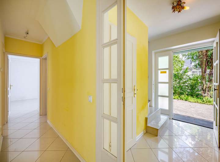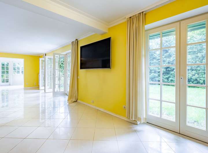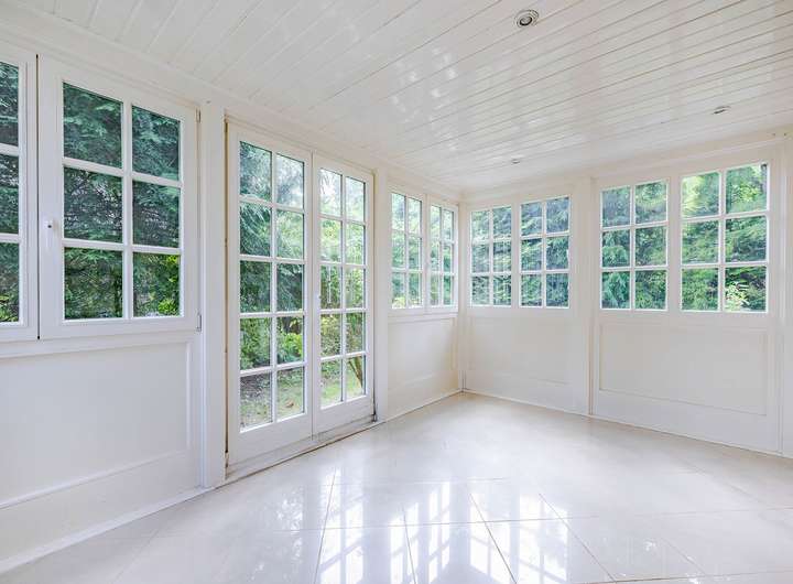 Die weißen Sprossenfenster mit zweifacher Verglasung, teilweise bodentief zur Gartenseite hin, lassen viel Tageslicht in die Räume und unterstreichen den charmanten Charakter des Hauses.