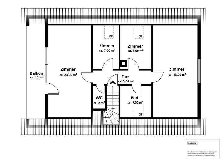 Im Obergeschoss befinden sich zwei großzügige Schlafzimmer mit jeweils ca. 23 m² – eines davon mit einem Balkon über die gesamte Zimmerbreite. Dazwischen liegen zwei kleinere Zimmer mit Blick in den Garten, die sich bei Bedarf zu einem größeren Raum zusammenlegen lassen. Ein Vollbad sowie ein separates WC sorgen auch auf dieser Ebene für Komfort.