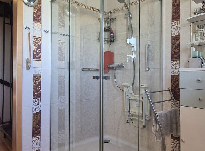 Ebenso finden Sie im Obergeschoss ein Tageslichtbad, ausgestattet mit Waschtisch, geräumiger Dusche, einer Sitz-Badewanne und Toilette.