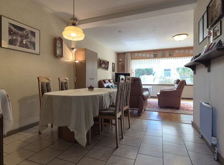 Sie betreten das Haus über den Eingangsbereich, aus dem Sie zur linken Hand die geräumige Küche betreten. Aus der Küche sowie dem Flur haben Sie direkten Zugang in den offen gestalteten, hellen Wohn- und Essbereich.