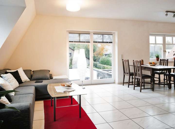 Zusätzliche Wohneinheit: Ein einladender Wohn-/Essbereich mit sonniger Dachterrasse über der Garage.