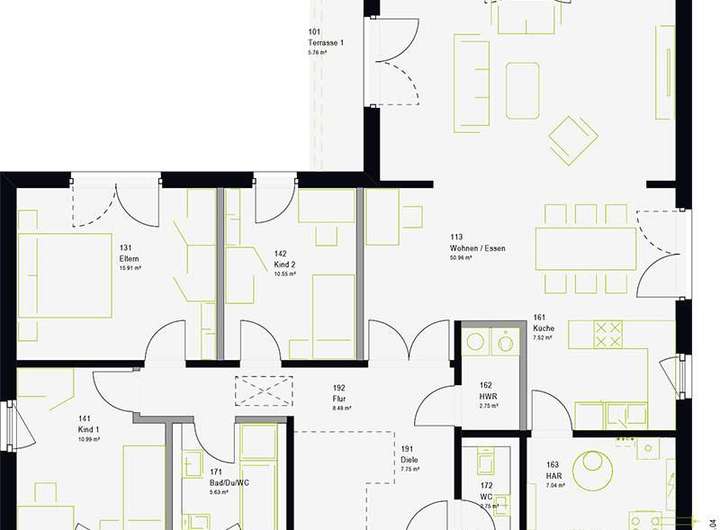 Die offenen Räume lassen sich ganz nach Wunsch und Bedarf der Baufamilien anpassen. Auf 136 m² sind der durchdacht und funktional geräumige Wohn-Ess-Bereich mit Gartenanbindung, Küche, Eltern- und Kinderzimmer sowie nützliche Stauraumlösungen realisiert. Großzügigkeit und Leichtigkeit individuellen Wohlfühlwohnens entstehen durch die serienmäßig höheren Wände.