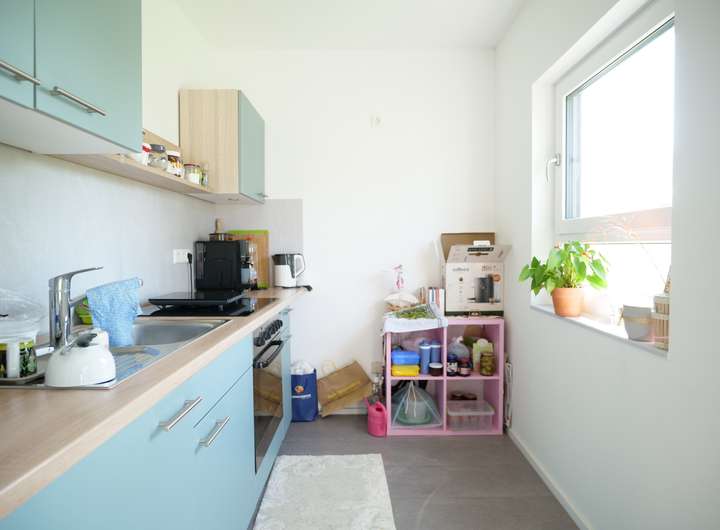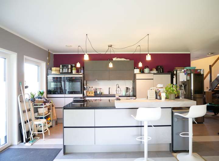 Hier überzeugt die neuwertige, integrierte Küche mit stilvoller Kochinsel, die keine Wünsche offenlässt. Vom Wohnbereich gelangen Sie direkt auf die Terrasse und in den Garten mit herrlichem Blick ins Grüne. Der ideale Ort für entspannte Stunden. Ein Gäste-WC rundet das Erdgeschoss ab.
