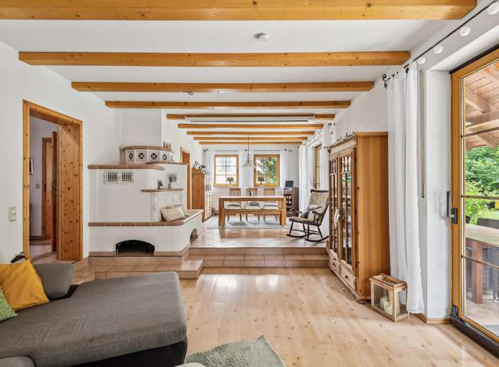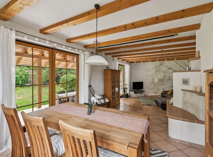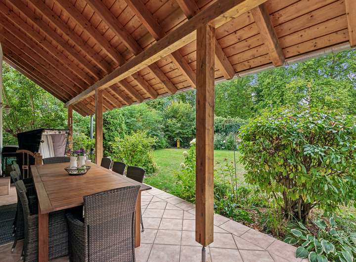 Der offen gestaltete Grundriss im Erdgeschoss verbindet Küche, Ess- und Wohnbereich auf harmonische Weise und schafft eine helle, freundliche Atmosphäre. Eine großzügige Terrasse ladet Sie zum Frühstück in der Morgensonne ein und erlaubt einen herrlichen Ausblick in den Garten.