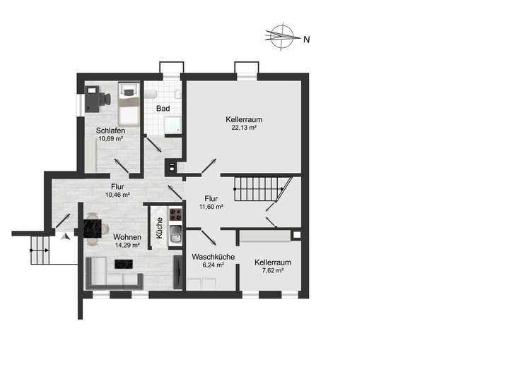Das Haus besitzt eine Einliegerwohnung mit separaten Eingang. Eine großzügige Wohn-Essküche sowie ein Schlafzimmer und ein Badezimmer finden hier seinen Platz. Das Untergeschoss ist voll nutzbar und bietet neben einer Waschküche zwei großzügige Kellerräume.