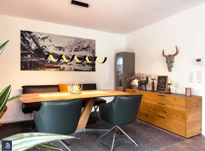 Schon beim Betreten empfängt Sie der lichtdurchflutete Wohn- und Essbereich, der durch zwei Zugänge direkt auf die großzügige Terrasse führt. Bodentiefe Fenster lassen viel Tageslicht herein und schaffen eine warme, einladende Atmosphäre – ideal, um Sonne, Gartenblick und gesellige Stunden zu genießen.