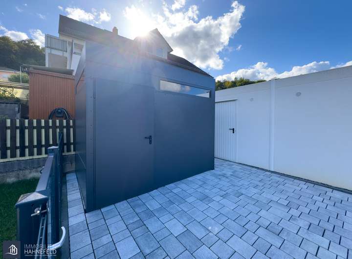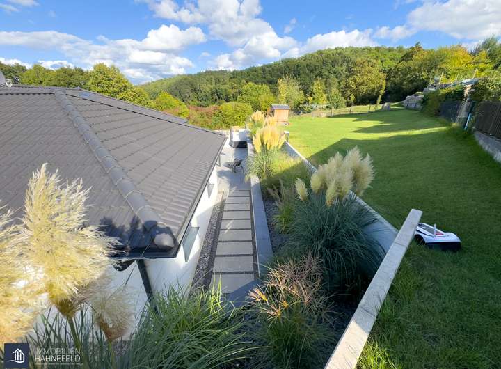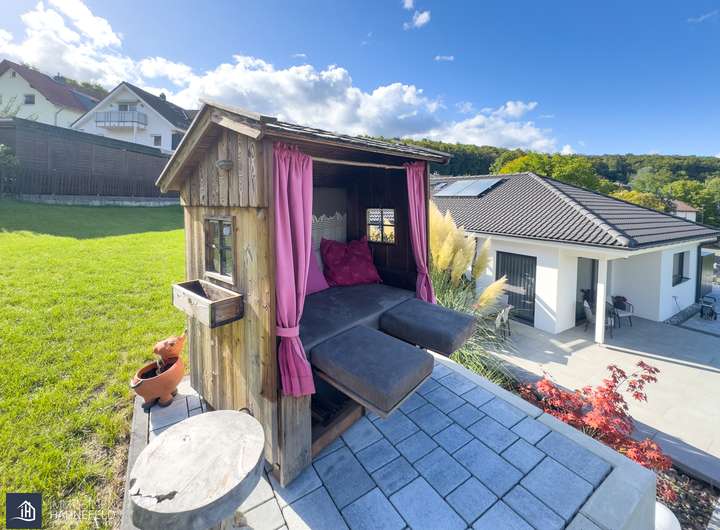 Der Außenbereich ist ein echtes Highlight: 2024 wurde die gesamte Anlage fertiggestellt, inklusive Terrassenüberdachung mit LED-Beleuchtung, Doppel-Carport mit Beleuchtung, zwei Gerätehäuser („Cubes“), Mülltonnenboxen von Metzler und zwei Mährobotern. Der Garten erstreckt sich über zwei Ebenen und ist auf Katalog-Niveau professionell gestaltet – mit Pflanzzonen, Steingärten und mehreren Rasenzonen. Zwei Terrassen bieten Sonnenplätze von morgens bis abends, während die Außenbeleuchtung stimmungsvolle Abende verspricht. Im September 2025 erhielt das Haus gemeinsam mit der Garage einen frischen Außenanstrich; Terrasse, Stellplätze und Wege sind stilvoll gepflastert.