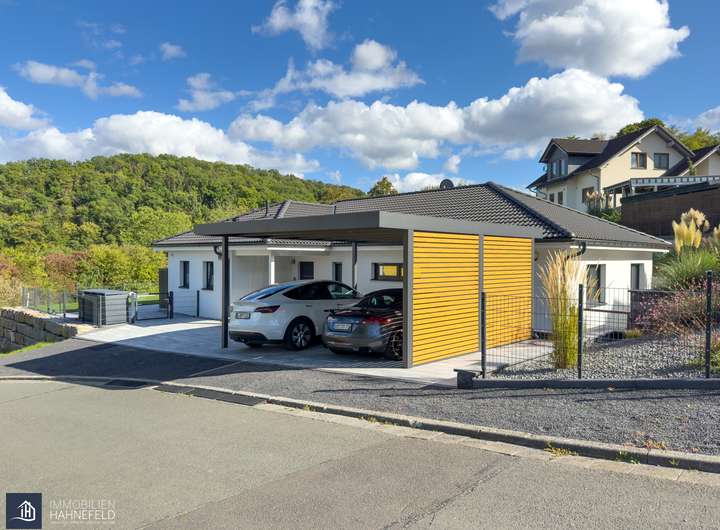 Für Fahrzeuge und zusätzliche Abstellmöglichkeiten stehen eine Garage, ein hochwertiger Doppel-Carport aus Aluminium mit Holzoptik sowie ein weiterer Außenstellplatz zur Verfügung.