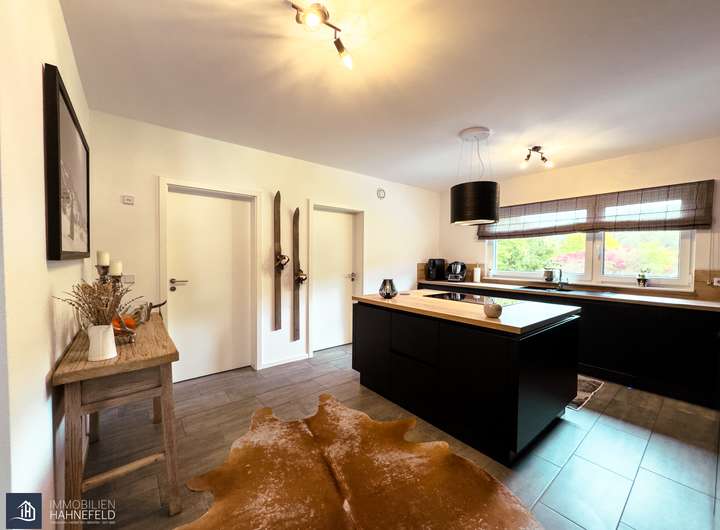 Die hochwertig ausgestattete Küche mit Kochinsel, leistungsstarker Inselabzugshaube und Geräten von Neff und Siemens sowie einer modernen Entkalkungsanlage aus 2024 ist perfekt für Kochliebhaber und kulinarische Kreativität.