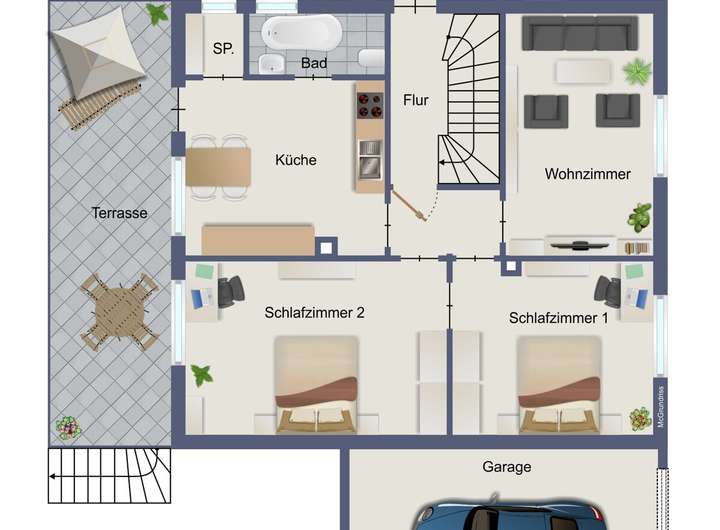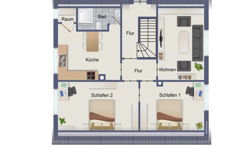 Bei den visualisierten Bildern im Innenbereich, handelt es sich um Einrichtungsbeispiele - diese sind nicht im Kaufpreis enthalten.