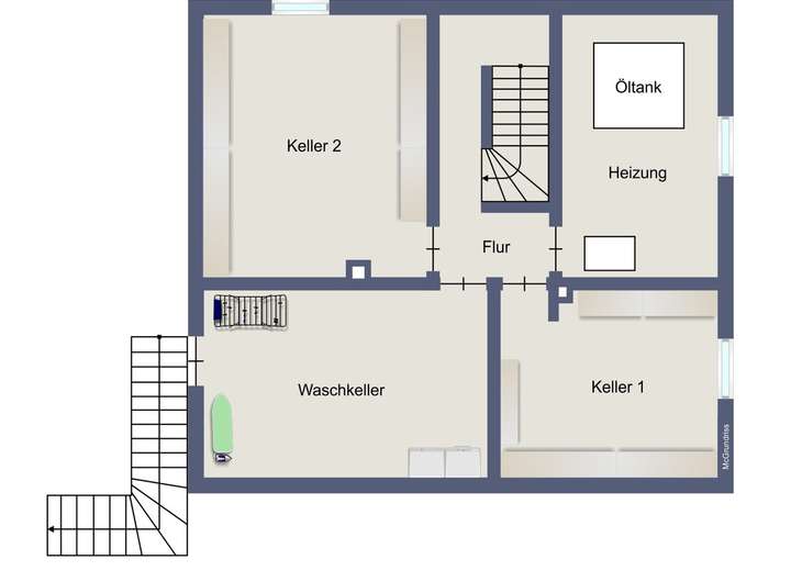 Das Haus ist voll unterkellert, hier befinden sich 2 Kellerräume, 1 Waschküche und der Heizungsraum.