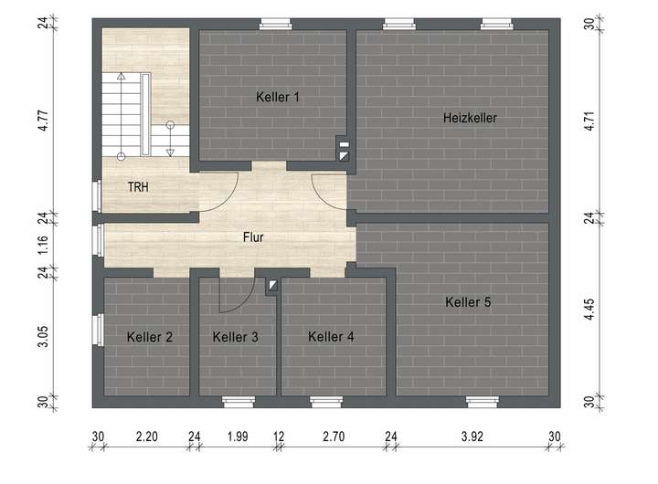 Das Dachgeschoß ist über das Treppenhaus zugänglich und nicht ausgebaut. Das Kellergeschoß ist ein typischer Keller mit Abstellräumen, Waschküche und Heizungskellerraum.
