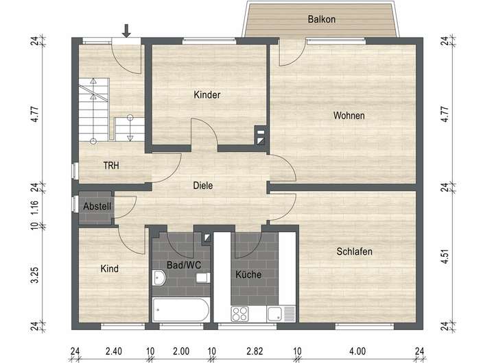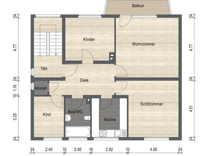 Die Wohnungen im Erd- und Obergeschoß mit jeweils ca. 90 m² sind vom Grundriss her völlig identisch und auch im Obergeschoß ohne Schrägen. Es gibt dort jeweils 4 Zimmer, eine Küche, das Bad und ein Gäste-WC. Alle Räume haben Tageslichtfenster.