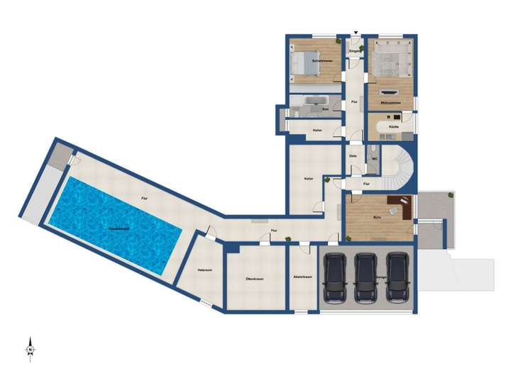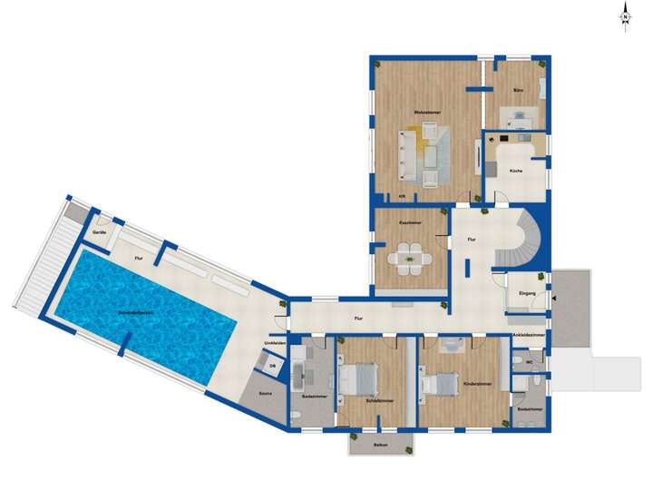 Besonderheiten: Großzügige Grundfläche und flexible Nutzungsmöglichkeiten durch Einliegerwohnung. Schwimmhalle als neues Herzstück für Sport und Entspannung. Sofort freie Verfügbarkeit, jedoch Modernisierungsbedarf.
