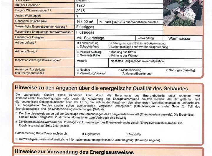 Eigener Flüssiggastank für beide Häuser vorhanden. Dusche Haus 1 wird mit Solarenergie betrieben.