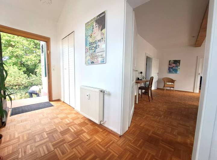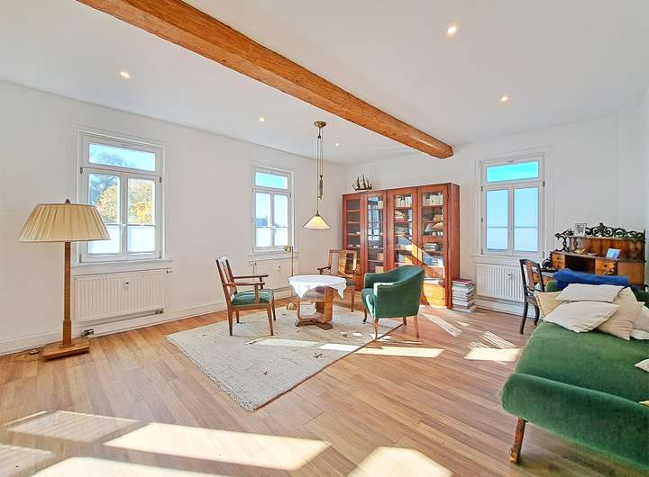 Die obere Wohnung verteilt sich auf das 1.Obergeschoss, Dachgeschoss und einen begehbaren Speicher. Sie bietet helle, großzügige Räume mit großer Raumhöhe, hochwertigen Ausstattungs-details im 1.OG. Zwei weitere Wohnräume und ein zusätzliches Tageslichtbad befinden sich im Dachgeschoss, ebenso wie eine große Loggia mit beeindruckendem Panoramablick über die gesamte Rheinebene.