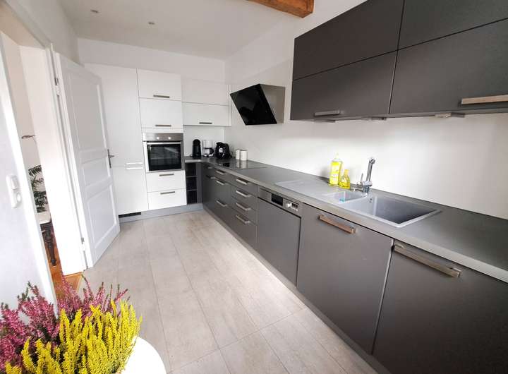 Die untere Wohnung verfügt über einen separaten Eingang im Anbau und erstreckt sich über das gesamte Erdgeschoss. Die Ausstattung umfasst hochwertiges Echtholzparkett, moderne Bäder, eine Einbauküche und eine flexible Raumaufteilung mit integrierter Schiebetür.