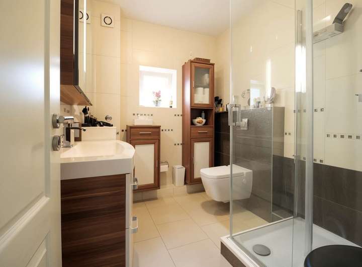 Hochwertige, pflegeleichte Fliesenböden in allen Räumen, im Keller teils mit Teppichbelag versehen