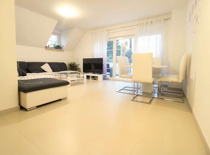 Im 1. Obergeschoss befindet sich eine gepflegte, aktuell vermietete Wohnung mit einer monatlichen Kaltmiete von 1.150 Euro. Sie umfasst vier Zimmer – darunter ein Kinder- und ein Schlafzimmer sowie einen lichtdurchfluteten Wohn- und Essbereich mit Balkonzugang. Über eine Treppe gelangt man in die ausgebaute Dachspitze, die zusätzlichen, gemütlichen Wohnraum bietet.