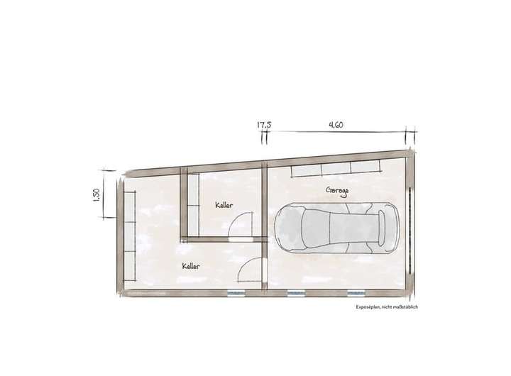 Im Teilkeller befinden sich zwei kleine Kellerräume sowie eine integrierte Garage. Der Zugang erfolgt über die Garage.