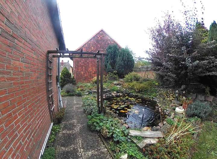 Kleiner Garten mit Gartenteich und Gartenhaus