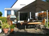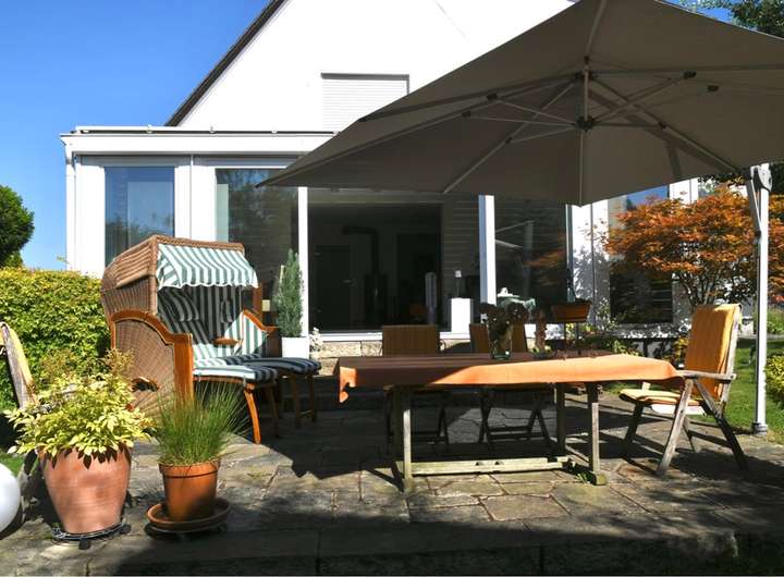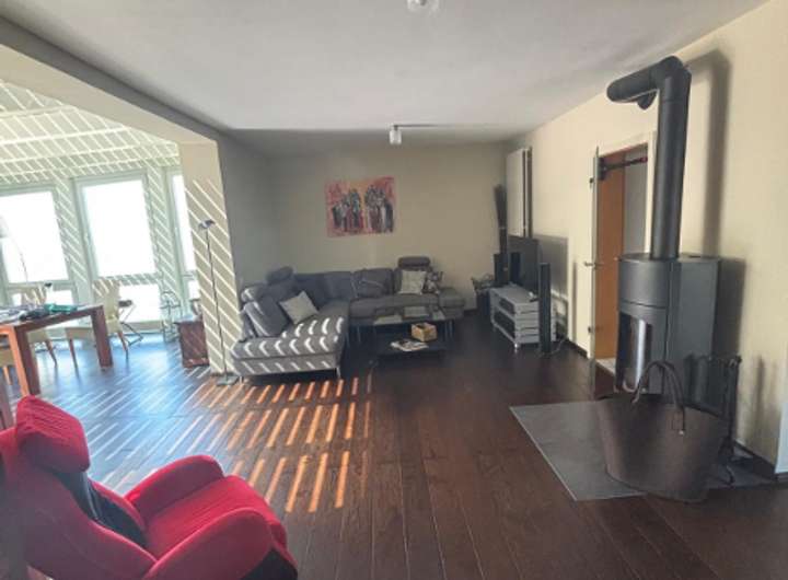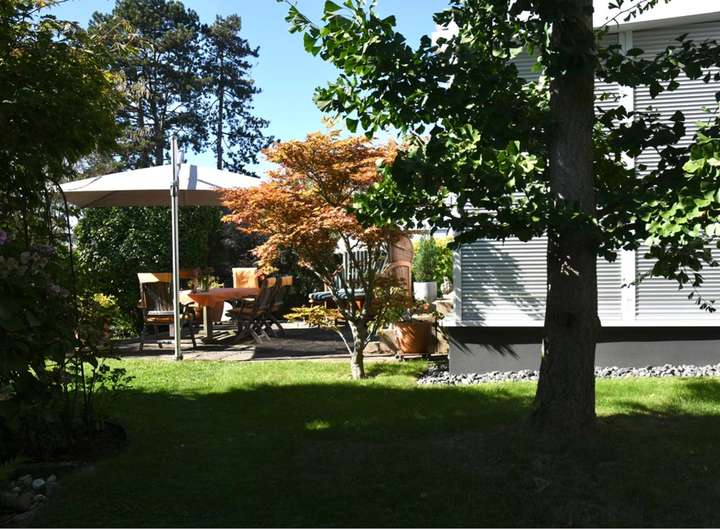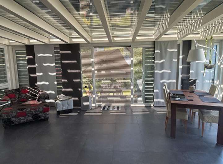 Der lichtdurchflutete Wohnbereich mit seinem offenen Grundriss schafft eine einladende, wohnliche Atmosphäre. Ein Kaminofen sorgt an kühleren Tagen für wohlige Wärme. Besonders hervorzuheben ist der angrenzende, große Wintergarten mit herrlichem Blick ins Grüne – die Front lässt sich vollständig öffnen und verbindet den Innenraum harmonisch mit dem Garten.
