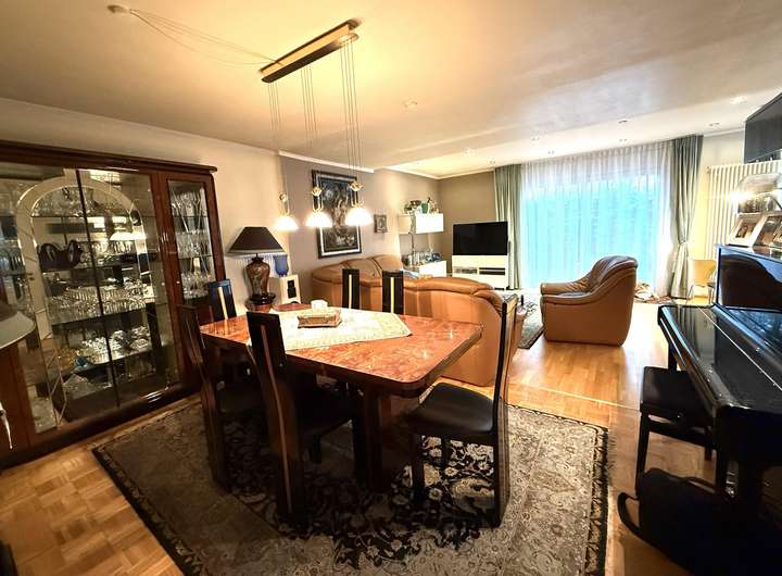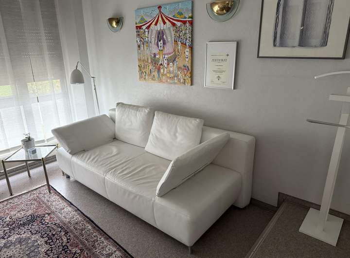 Im Obergeschoss befindet sich ein großes Wohn-/Esszimmer (61qm) mit Zugang zur teils überdachten und im Sommer kaum einsehbaren Dachterrasse (Südwest), ein Schlaf- mit angrenzenden Ankleidezimmer, ein Duschbad mit WC, Einbauküche sowie zwei weitere Zimmer.