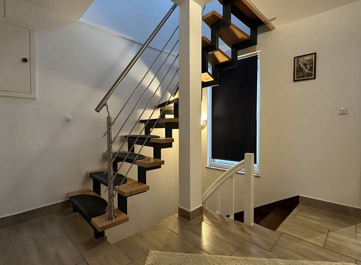 Das Obergeschoss beherbergt ein Badezimmer, eine funktionale Küche (auf Wunsch zur Übernahme oder Entsorgung), ein gemütliches Wohnzimmer, einen Abstellraum sowie eine großzügige Diele. Von der Küche aus gelangt man direkt auf den Balkon, der zum Entspannen im Freien einlädt.