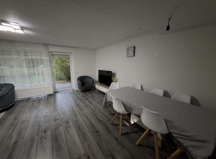 Die Wohnung im Erdgeschoss (ca. 87 m²) verfügt über ein Wohnzimmer, eine Küche, ein Eltern- und ein Kinderschlafzimmer, sowie über ein Badezimmer. Vom Wohnzimmer aus haben Sie Zugang zur Terrasse und damit auch zum Garten. Diese Wohnung ist aktuell vermietet. Die Kaltmiete beträgt (incl. Nutzung des Kellers) monatlich 900 €.