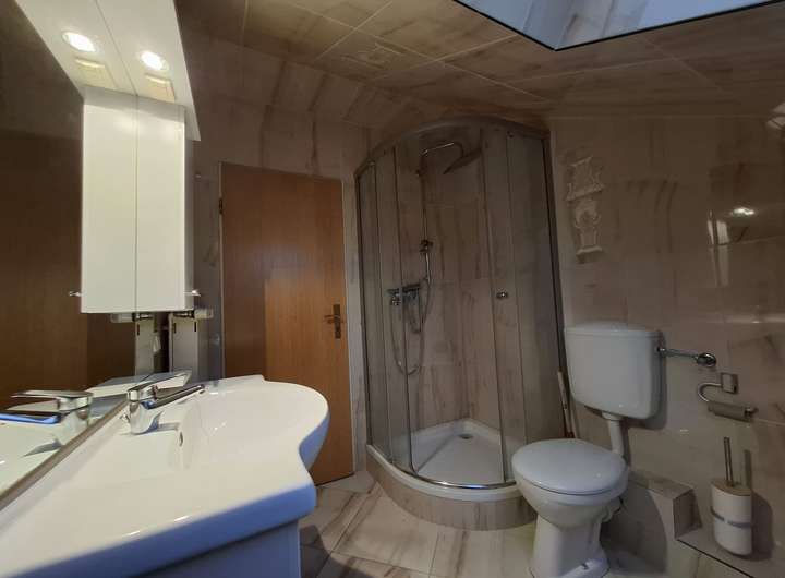 In der Wohnung im Obergeschoss befindet sich ebenfalls ein Wohnzimmer, eine Küche, ein Eltern- und ein Kinderschlafzimmer, ein Badezimmer und zusätzlich noch ein Abstellraum. An das Wohnzimmer schließt sich ein Balkon an, der zum Verweilen an warmen Abenden einlädt. Diese Wohnung (ca. 73 m²) ist aktuell leerstehend.