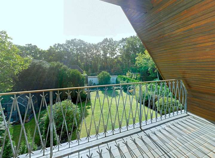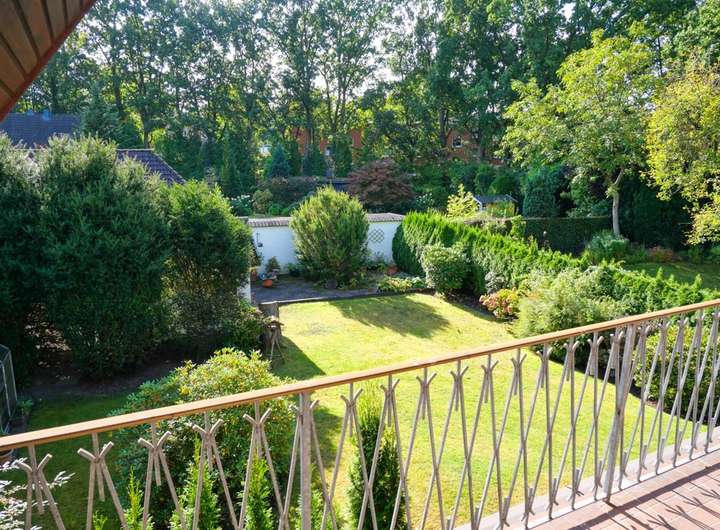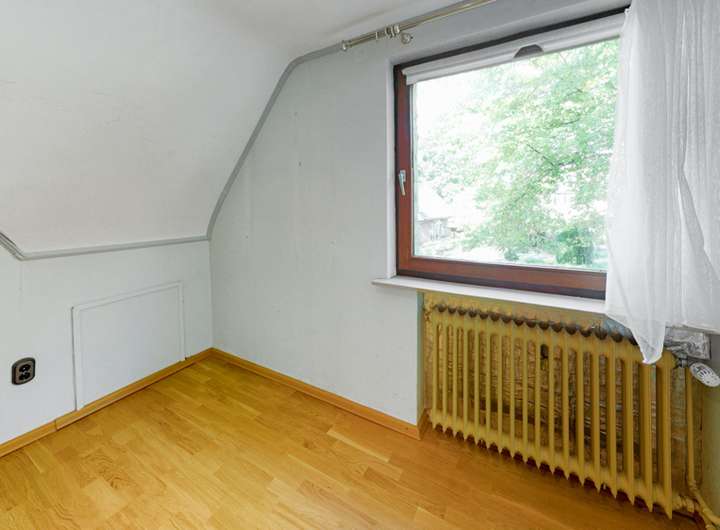 Im Obergeschoss befinden sich drei Schlafzimmer unterschiedlicher Größe. Das große Schlafzimmer zur Gartenseite verfügt über einen Zugang zum Balkon mit schönem Blick über das Grundstück und die Nachbarschaft. Das zweite große Schlafzimmer liegt zur Hausseite und wird durch eine Dachgaube zusätzlich aufgewertet. Von hier führt eine Treppe in den ausgebauten Spitzboden, der sich hervorragend als zusätzlicher Hobby- oder Arbeitsraum eignet. Das kleinere Kinderzimmer hat ebenfalls einen eigenen Zugang zu einem weiteren Teil des Spitzbodens, der sich ideal als Stauraum oder kleine Spielebene nutzen lässt. Das Bad auf dieser Etage ist hell, mit Badewanne und Fenster ausgestattet, klassisch im Stil seiner Zeit.