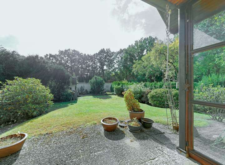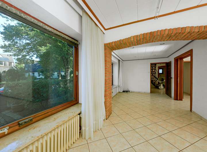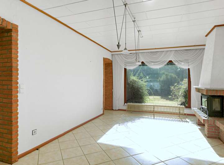 Im Erdgeschoss empfängt Sie ein kleiner Windfang mit Garderobe, von dem der zentrale Flur in alle Räume führt. Die Küche verfügt über eine praktische Durchreiche und einen direkten Zugang zur großen Südterrasse, die zu sonnigen Frühstücken im Freien einlädt. Das Duschbad ist geräumig, entspricht jedoch nicht mehr dem heutigen Ausstattungsstandard. Herzstück des Hauses ist der großzügige Wohn- und Essbereich mit großen Panoramafenstern und Blick in den Garten. Ein Kamin sorgt für eine gemütliche Atmosphäre, ist derzeit jedoch abgemeldet und müsste für eine erneute Nutzung über den Schornsteinfeger geprüft und mit einer neuen Kassette ausgestattet werden. Ein weiteres Zimmer auf dieser Ebene kann flexibel als zweites Wohnzimmer, Arbeits- oder Gästezimmer genutzt werden. Die überdachte Terrasse erstreckt sich über zweidrittel der Hausbreite und verbindet das Haus harmonisch mit dem Garten.