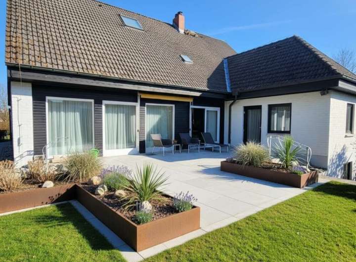 Die großzügige Terrasse und der Garten laden zum Entspannen und Verweilen ein.